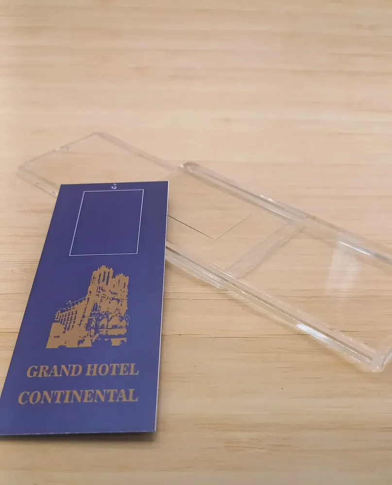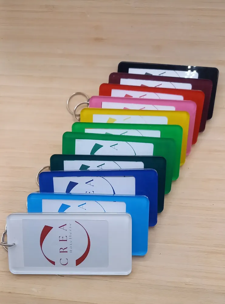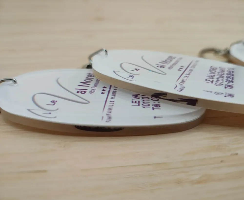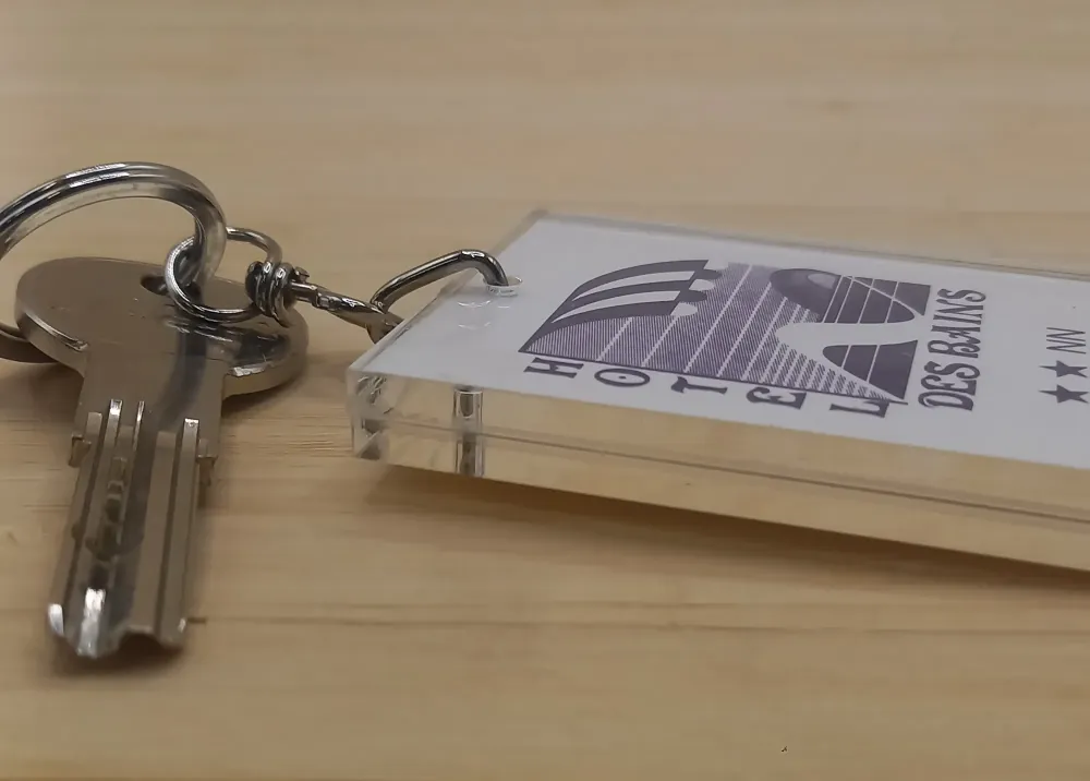 Apportez une touche d'élégance à vos clés avec nos porte-clés en plexiglass, fabriqués dans les Landes. Disponibles en différentes formes et finitions, ils peuvent être personnalisés pour refléter l'identité de votre établissement. Leur transparence et leur brillance en font un choix raffiné pour tout type d'hébergement.
