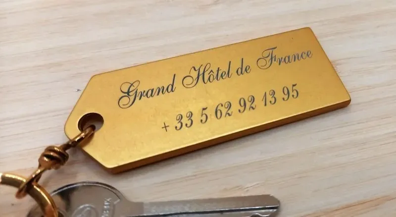 Nos porte-clés de la gamme 'Classic', produits dans les Landes, sont la solution idéale pour une identification efficace et esthétique des chambres. Ces porte-clés en aluminium poli ou brossé, argent ou doré sont disponibles en diverses formes. Ils s'adaptent à tous les styles d'hébergement. Personnalisables avec votre logo et numéro de chambre, ils allient simplicité et fonctionnalité avec élégance.